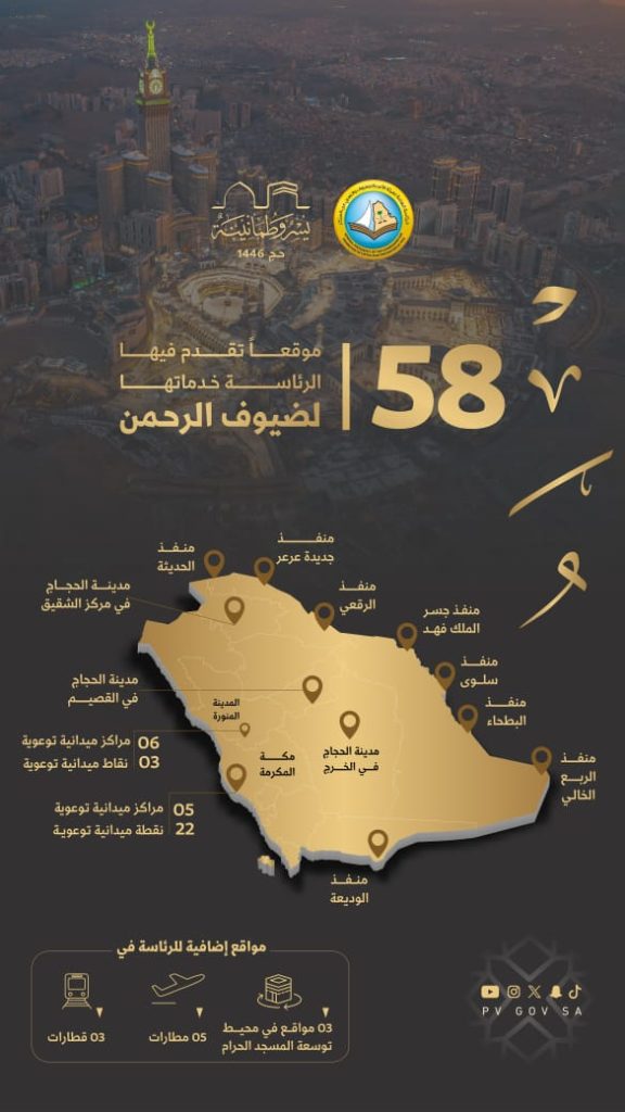 وزودت الرئاسة العامة هذه المواقع بعدد من خدماتها التقنية والمشاريع الرقمية النوعية، وتم تهيأتها لتكون محطات لاستقبال وخدمة ضيوف الرحمن، للمساهمة في إثراء تجربة الحاج والزائر وتمكينهم من أداء نسكهم وفق المنهج الشرعي.