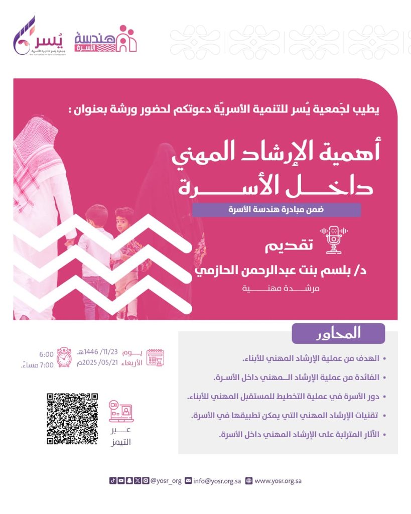 ضمن الأنشطة والبرامج والفعاليات التي تقوم بها جمعية يسر للتنمية الأسريّة بمكة المكرمة تقيم الجمعية ورشة بعنوان :