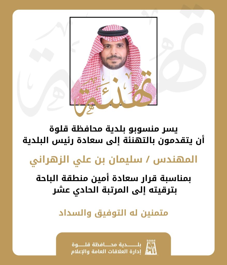 يسر صحيفة صدى التطوع الإعلامي ونيوزs أن تتقدم بالتهنئة إلى سعادة رئيس البلدية المهندس سليمان بن علي الزهراني من أبناء محافظة قلوة بمناسبة قرار سعادة أمين منطقة الباحة بترقيته إلى المرتبة الحادية عشرة. نتمنى له التوفيق والسداد في مهامه الجديدة، وأن يحقق المزيد من النجاحات والإنجازات التي تساهم في تطوير وازدهار المنطقة.