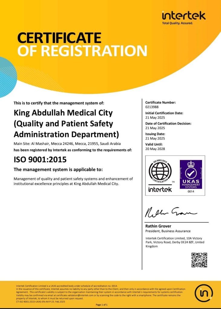 في إنجاز جديد يعكس التزامها المستمر بأعلى معايير الجودة والتميز المؤسسي، حصلت مدينة الملك عبدالله الطبية بالعاصمة المقدسة – ممثلة في إدارة الجودة وسلامة المرضى – على شهادة ISO 9001:2015 العالمية من جهة الاعتماد الدولية العريقة Intertek، إحدى أبرز المؤسسات المتخصصة في تقييم وتدقيق أنظمة الإدارة، والمعتمدة من قبل الهيئة البريطانية للاعتماد UKAS برقم اعتماد (0014).