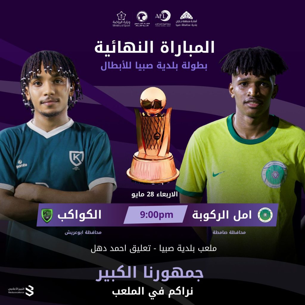 وستشهد مواجهة الكبار على أرض الملعب وستجمع المباراة النهائية فريقي أمل الركوبة من صامطة والكواكب من أبو عريش في صراع مباشر على لقب البطولة. يعد هذا اللقاء تتويجاً لمسيرة حافلة بالإثارة والتنافس الشريف التي شهدتها البطولة منذ انطلاقها، حيث أظهرت الفرق المشاركة مستويات فنية عالية وروحاً رياضية مميزة.
