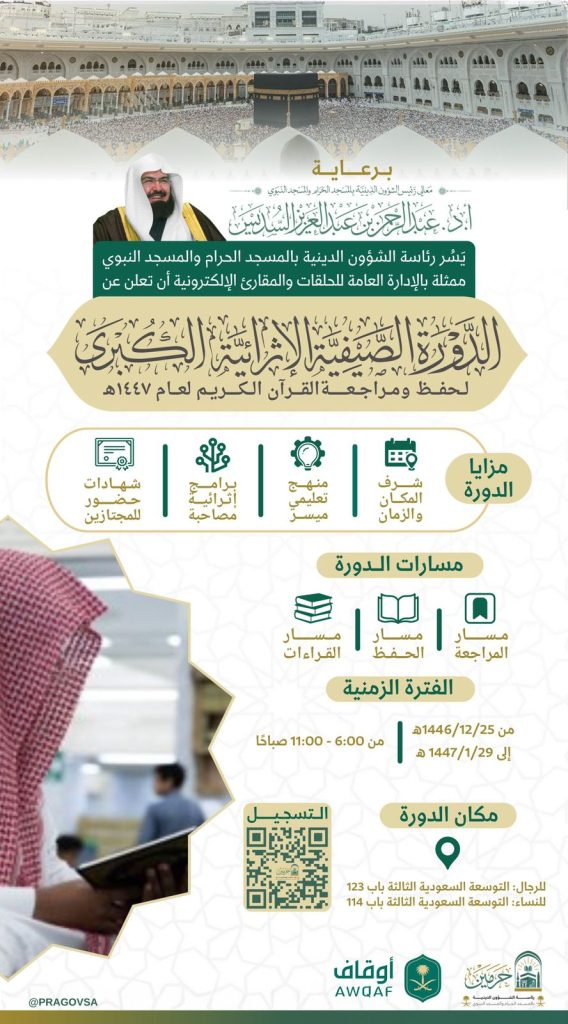 الصيفية الإثراية الكبرى لحفظ ومراجعة القرآن الكريم لعام ١٤٤٧هـ برعاية معالي رئيس الشؤون الدينية بالمسجد الحرام والمسجد النبوي الشيخ الدكتور عبدالرحمن السديس، خلال الفترة من ١٤٤٦/١٢/٢٥هـ إلى ١٤٤٧/١/٢٩هـ، والمقامة بالمسجد الحرام في التوسعة السعودية الثالثة بجوار باب ١٢٣.