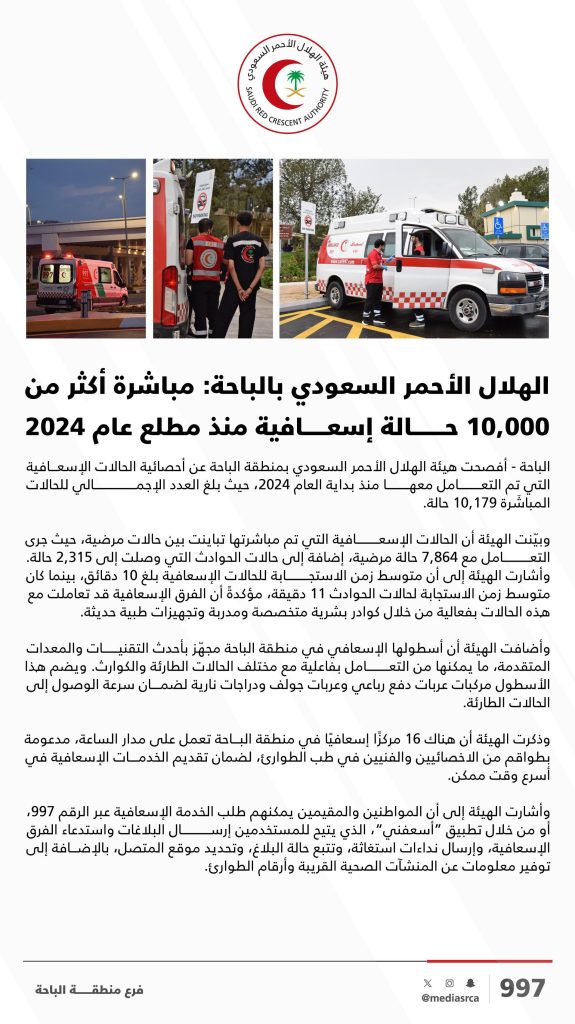 أفصحت هيئة الهلال الأحمر السعودي بمنطقة الباحة عن إحصائية الحالات الإسعافية التي تم التعامل معها منذ بداية العام 2024، حيث بلغ العدد الإجمالي للحالات المباشرة 10,179 حالة.