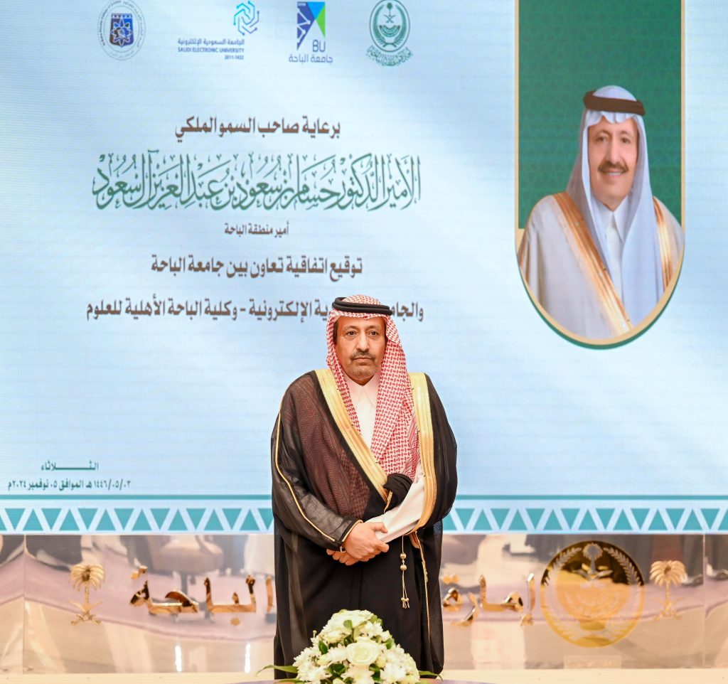 شهد صاحب السمو الملكي الأمير الدكتور حسام بن سعود بن عبدالعزيز أمير منطقة الباحة اليوم ، توقيع اتفاقيتين لجامعة الباحة مع الجامعة السعودية الإلكترونية وكلية الباحة الأهلية للعلوم، وذلك بديون الإمارة ، بحضور معالي رئيس الجامعة الاستاذ الدكتور عبدالله بن يحيى الحسين، ورئيس الجامعة السعودية الإلكترونية الدكتور محمد بن يحيى مرضي، وعميد كلية الأهلية للعلوم الدكتور سعيد بن مشبب القحطاني.