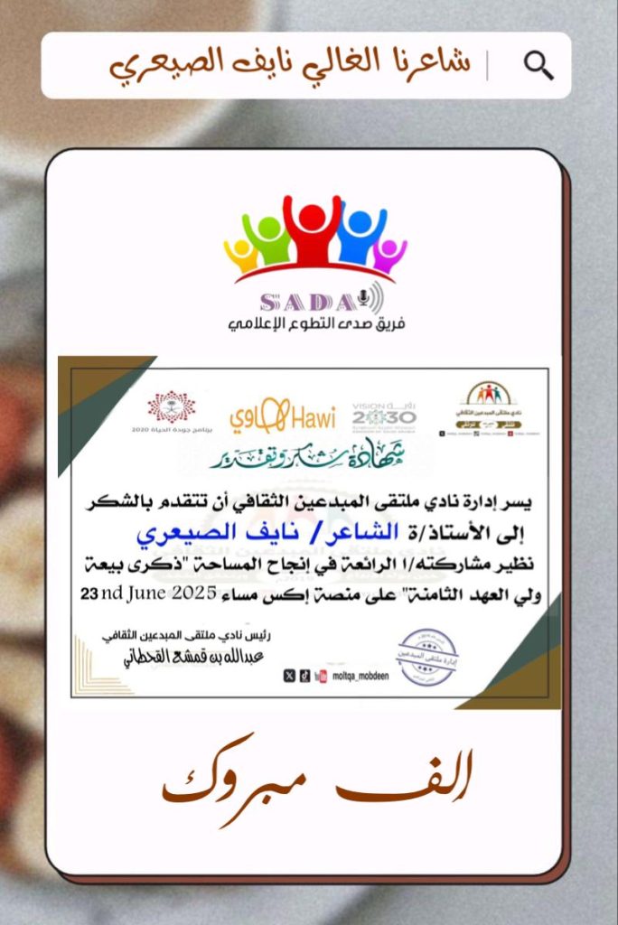 قدم نادي ملتقى المبدعين الثقافي أمسية شعرية بمناسبة ذكرى بيعة والي العهد الثامنة على منصة اكس ولقد حضره العديد من المثقفين والاعلامين والشعار ولقد شارك العديد من الشعار بقصائد تعبر عن حبهم للوطن والي والي العهد سيدي محمد بن سلمان ال سعود وبدور صحيفة صدى نيوزs وفريق صدى التطوع الإعلامي ان تقدم جزيل الشكر لنادي المبدعين الثقافي على مايقومون به من أثر الثقافة السعودية عامه والشكر الجزيل الي سعادة العميد عبدالله القحطاني رئيس نادي ملتقى المبدعين الثقافي والي دارة الملتقى عامه