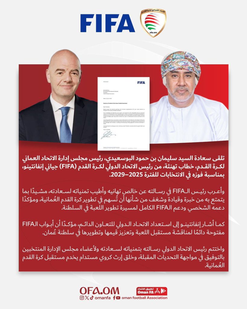 كما أشار إلى دعمه الشخصي ودعم FIFA الكامل لجهود الاتحاد العماني واستعداد المنظمة للتعاون المستمر وفتح قنوات التواصل لمناقشة مستقبل اللعبة وتعزيز قيمها في السلطنة وفي ختام رسالته تمنى إنفانتينو التوفيق للرئيس المنتخب وأعضاء مجلس الإدارة في مواجهة التحديات المقبلة وتحقيق إرث كروي يخدم الأجيال القادمة.