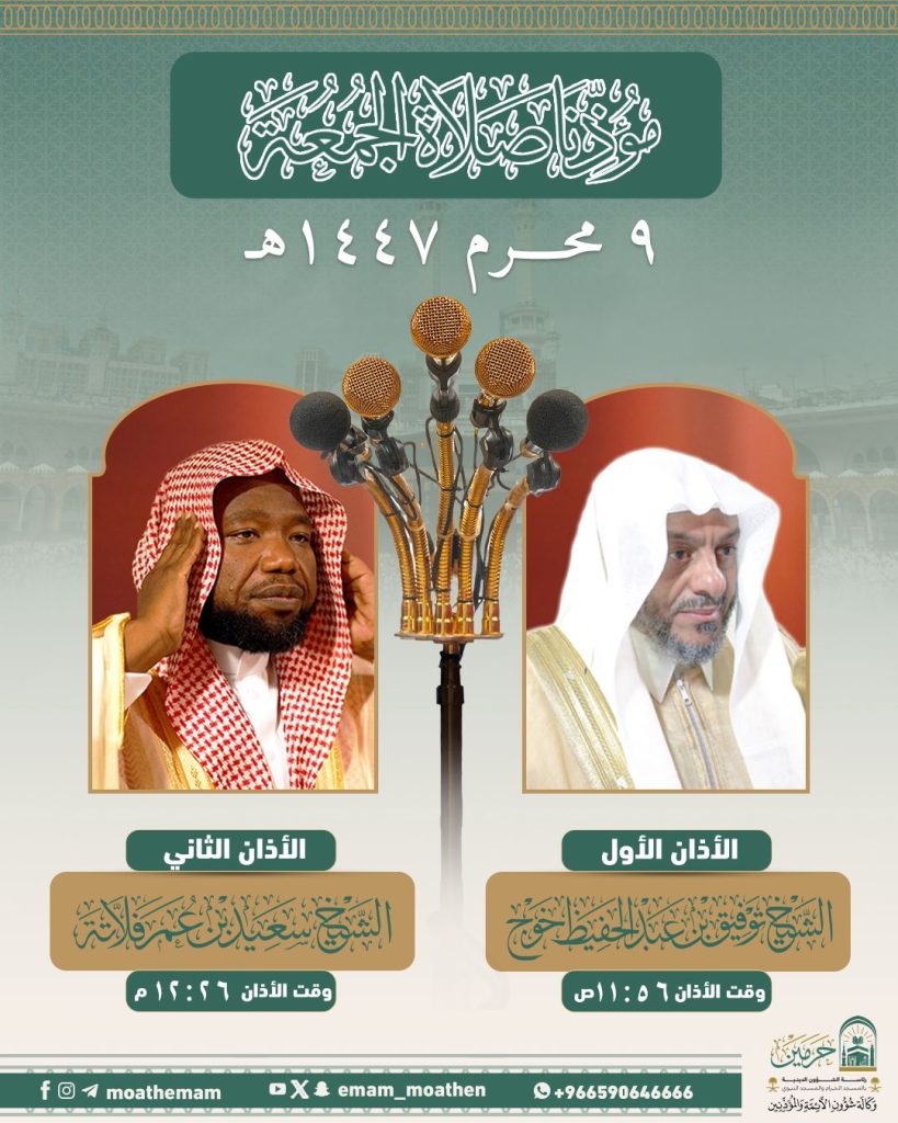 أوضحت رئاسة الشؤون الدينية بالمسجد الحرام والمسجد النبوي أسماء المؤذنين المكلفين برفع أذان صلاة الجمعة يوم غدٍ، الموافق التاسع من شهر محرم 1447هـ، وذلك في إطار جهودها المستمرة لتنظيم أوقات الصلاة وإعلام قاصدي وزوار الحرمين الشريفين بمواعيد الأذان والمؤذنين المكلّفين.