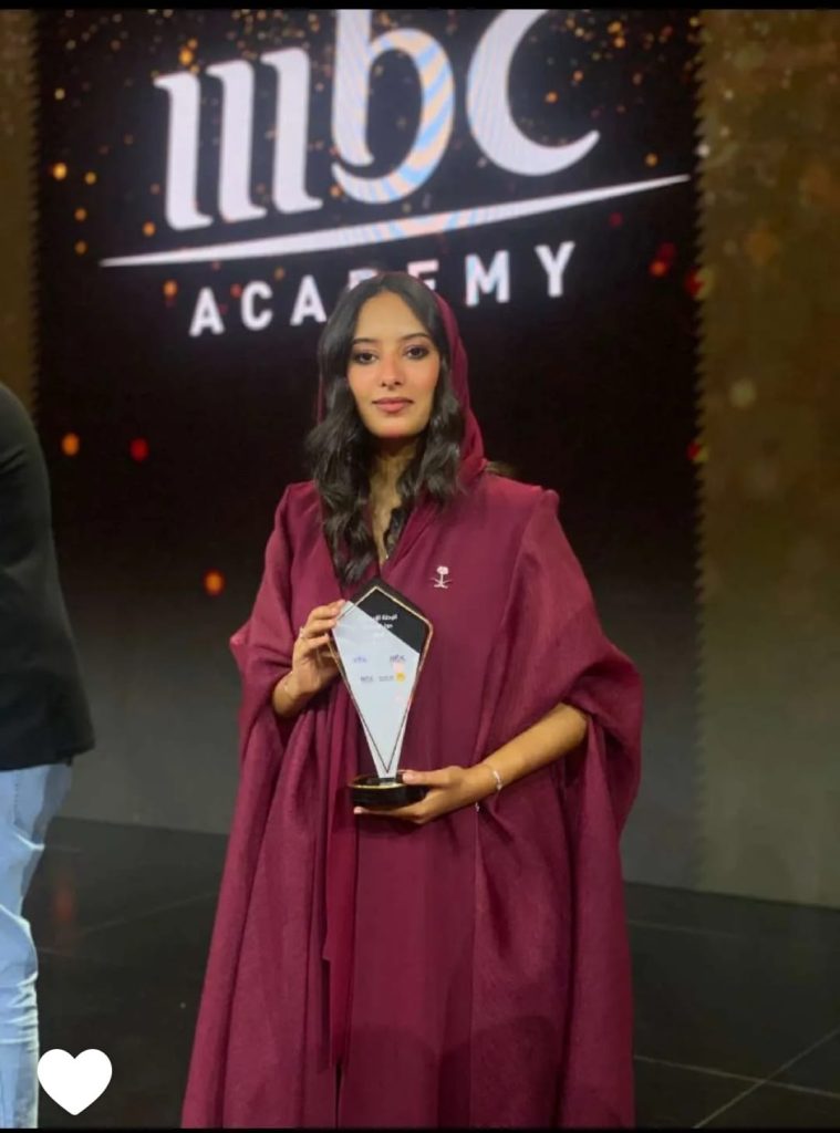 لحصولها على المركز الأول، في أكاديمية تلفزيون (Mbc) والذي تم تكريمها يوم أمس، في مدينه الرياض، ضمن حفل القناة الذي حضره لفيف من الإعلاميين العرب.