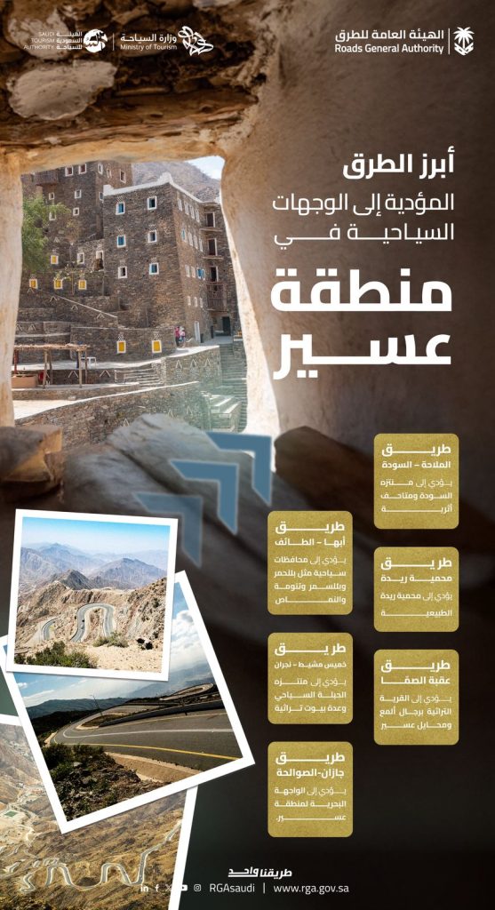في حين شملت الطرق المؤدية إلى المواقع السياحية طريق الملاحة/السودة المؤدي إلى متنزه السودة والمتاحف الأثرية، وطريق محمية ريدة المؤدي إلى محمية ريدة، وطريق عقبة الصماء المؤدي إلى القرية التراثية برجال ألمع ومحايل عسير، وطريق أبها / الطائف المؤدي إلى محافظات سياحية صيفية مثل بللحمر، وبللسمر، وتنومة، والنماص، وطريق الرياض المؤدي إلى البيوت التراثية والمتنزهات، وطريق الساحل جازان/الصوالحة المؤدي إلى الواجهة البحرية لعسير، وطريق خميس مشيط / نجران المؤدي إلى متنزه الحبلة السياحي والبيوت التراثية، وتُشكل هذه الطرق نقطة وصل حيوية تسهل الوصول إلى التنوع الثقافي والطبيعي المتفرد في المنطقة.