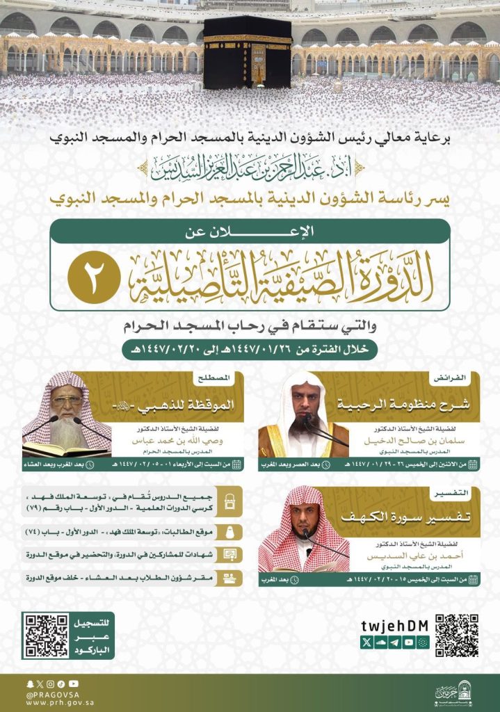 أوضحت رئاسة الشؤون الدينية بالمسجد الحرام والمسجد النبوي عن إقامة الدورة الصيفية التأصيلية الثانية لعام 1447هـ، والتي تُعقد في رحاب المسجد الحرام بمكة المكرمة، خلال الفترة من يوم غد الإثنين 26 محرم حتى نهاية 20 صفر 1447هـ.