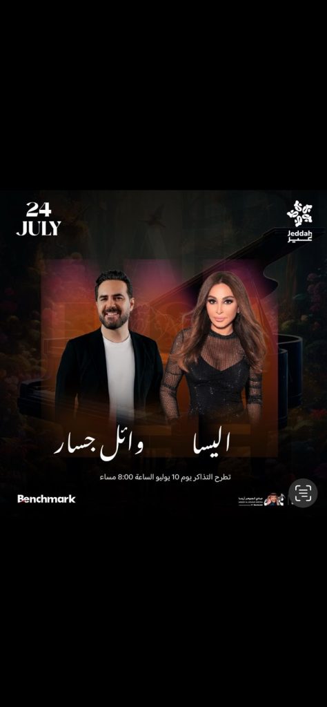 تستعد مدينة جدة لاستضافة حفل غنائي يجمع النجمة اللبنانية إليسا والنجم وائل جسار، مساء الخميس 24 يوليو، على مسرح عبادي الجوهر أرينا، ضمن فعاليات موسم جدة 2025، بتنظيم من شركة بنش مارك. وتُعد هذه الليلة واحدة من أبرز الحفلات الغنائية في الموسم .