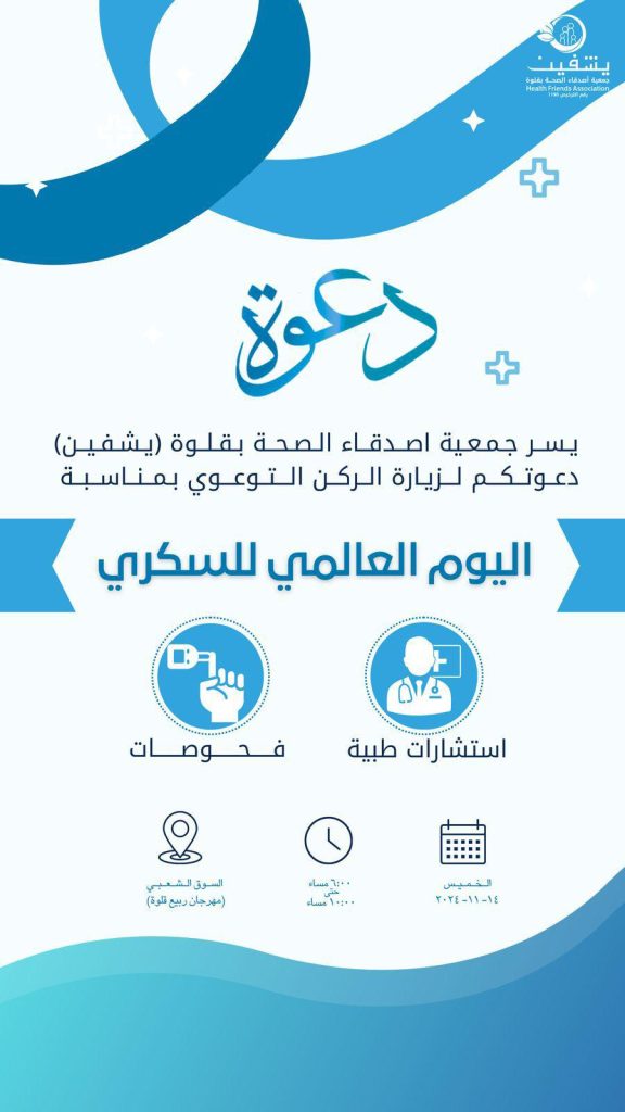 تقيم جمعية أصدقاء الصحة بقلوة (يشفين) ركن توعوي بمناسبة اليوم العالمي للسكري. تتضمن الفعالية استشارات طبية وفحوصات، وذلك يوم الخميس 14 نوفمبر 2024 من الساعة 6:00 مساءً حتى 10:00 مساءً في السوق الشعبي مهرجان ربيع قلوة.