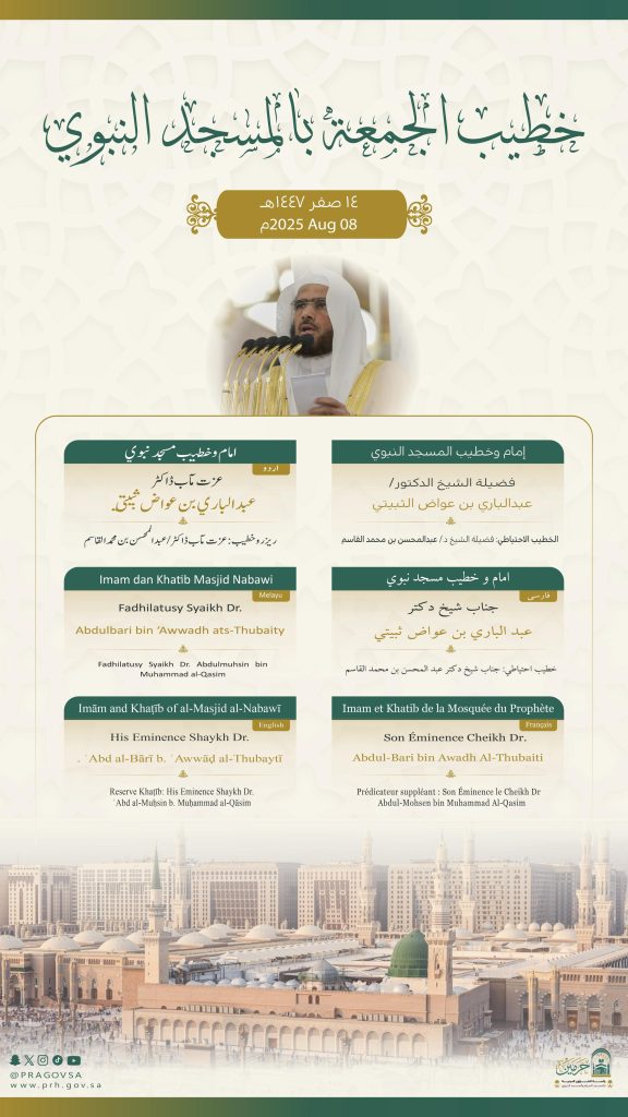 أوضحت رئاسة الشؤون الدينية بالمسجد الحرام والمسجد النبوي، عن أسماء خطيبا وإماما صلاة الجمعة في الحرمين الشريفين ليوم بعد غد الجمعة الموافق 14 صفر 1447هـ وذلك ضمن جدولها الدوري لتنظيم الإمامة والخطابة.