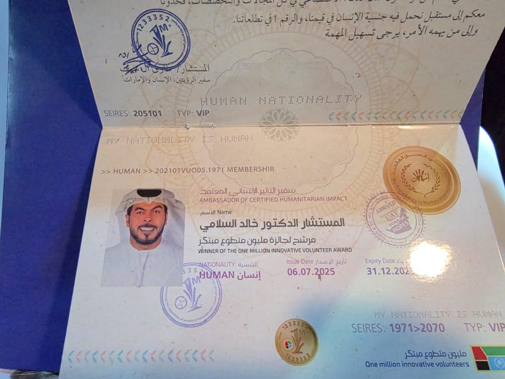وتُعَدُّ جائزة “مليون متطوع مبتكر” لعام المجتمع 2025 مبادرة حديثة أطلقتها المؤسسة لتعزيز الابتكار في العمل التطوعي وتشجيع رواد العطاء المجتمعي. ومن المقرر الكشف عن الفائزين وتكريمهم خلال حفل رسمي سيقام في نوفمبر 2025، ضمن فعاليات عام المجتمع في دولة الإمارات. الجدير بالذكر أن عام 2025 في الإمارات يحمل شعار “يدًا بيد” بعد أن أعلنه صاحب السمو الشيخ محمد بن زايد آل نهيان رئيس الدولة عامًا للمجتمع، بهدف تشجيع كل من يعتبر الإمارات وطنًا له على الإسهام الفاعل في المجتمع من خلال “الخدمة المجتمعية، والتطوع، والمبادرات المؤثرة”. ويأتي ترشيح الدكتور خالد السلامي لهذه الجائزة كتجسيد عملي لهذه الرؤية الوطنية، حيث يُبرِز نموذجًا مشرّفًا للمواطن الفاعل الذي يسهم بخبراته ووقته في خدمة مجتمعه، مما يجعل من هذا الترشيح تكريمًا مستحقًا ومحفّزًا للآخرين على الاقتداء بنهجه في البذل والعطاء.