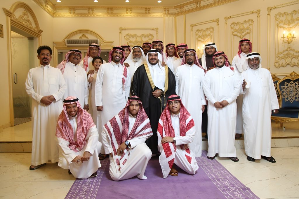 في إحدى قاعات الأفراح في مكة المكرمة، وسط حضور الأهل والأصدقاء، وأزدان الحفل بالمجسات والألعاب الشعبية.