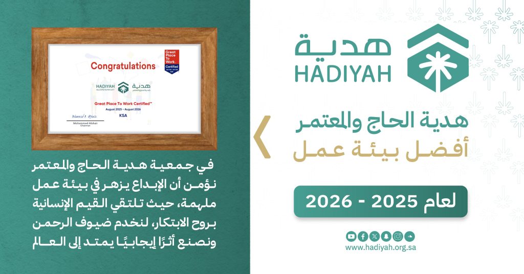 حصلت جمعية هدية الحاج والمعتمر على شهادة أفضل بيئة عمل لعام 2025 – 2026، وهي شهادة اعتراف دولي تمنحه منظمة “Great Place To Work” للشركات التي توفر بيئة عمل متميزة لموظفيها، ويأتي هذا الإنجاز تأكيدًا على التزام الجمعية بتهيئة بيئة عمل مُلهِمة، تجمع بين القيم الإنسانية وروح الابتكار، لخدمة ضيوف الرحمن وتحقيق أثر إيجابي يمتد إلى العالم.