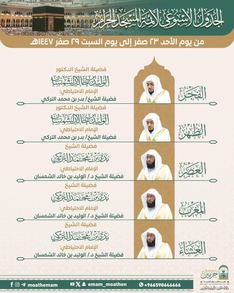 أوضحت رئاسة الشؤون الدينية بالمسجد الحرام والمسجد النبوي عن الجدول الأسبوعي لأئمة الحرمين الشريفين للفترة من يوم الأحد 23 صفر إلى السبت 29 صفر 1447هـ وذلك في إطار حرصها المستمر على تنظيم الشعائر، وتمكين المصلين من أداء صلواتهم في أجواء من الطمأنينة والسكينة.