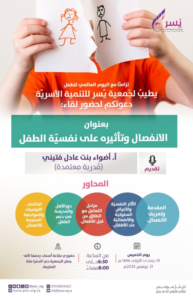 ضمن الأنشطة والبرامج والفعاليات والمبادرات التي تقوم بها جمعية يسر للتنمية الأسرية بمكة المكرمة وتزامنًا مع اليوم العالمي للطفل