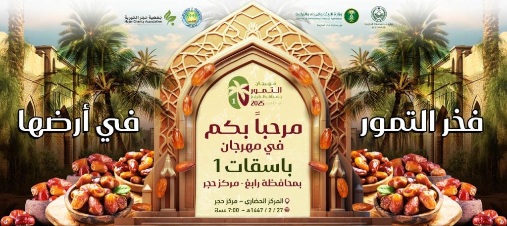 يستعد مكتب وزارة البيئة والمياه والزراعة بمحافظة رابغ، لتدشين مهرجان التمور الأول “باسقات 1″بمركز حجر، وذلك يوم الخميس الموافق ٢٧/ ٢/ ١٤٤٧ هـ ولمدة ثلاثة أيام، بمشاركة المزارعين والجهات الحكومية والأهلية ذات العلاقة، في إطار دعم مزارع النخيل والتمور وتعزيز مكانة المنتج المحلي.