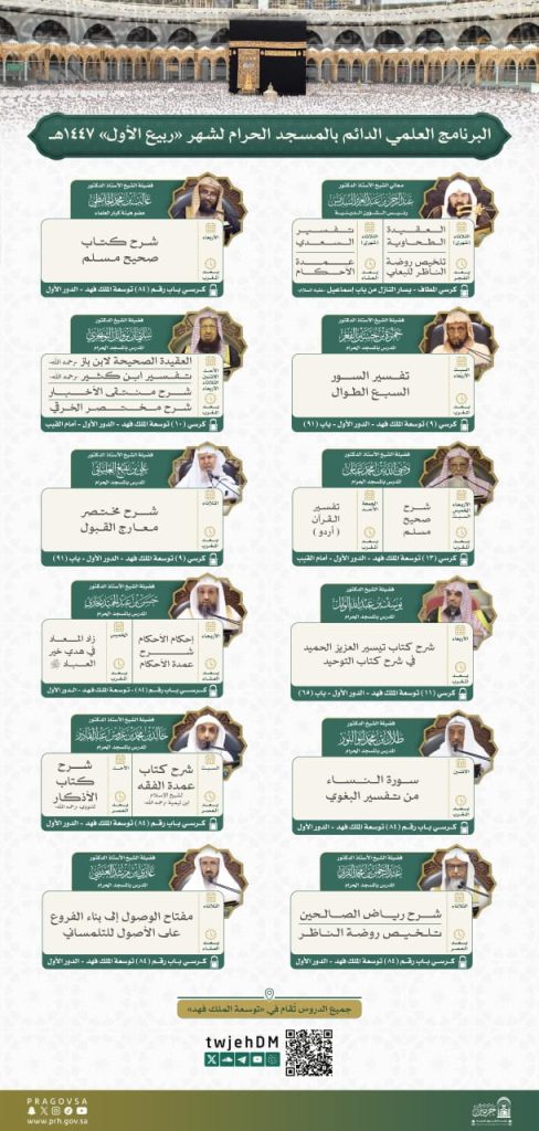 أصدرت رئاسة الشؤون الدينية بالمسجد الحرام والمسجد النبوي جدول البرنامج العلمي الدائم بالمسجد الحرام لشهر ربيع الأول 1447هـ.