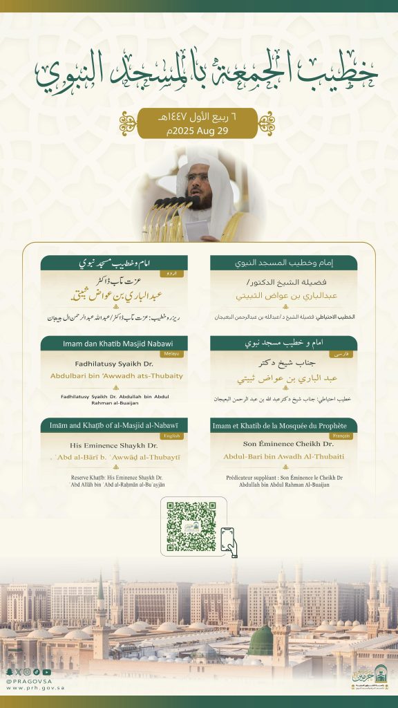 أوضحت رئاسة الشؤون الدينية بالمسجد الحرام والمسجد النبوي، عن أسماء خطيبا وإماما صلاة الجمعة في الحرمين الشريفين ليوم بعد غد الجمعة الموافق 6 ربيع الأول 1447هـ وذلك ضمن جدولها الدوري لتنظيم الإمامة والخطابة.