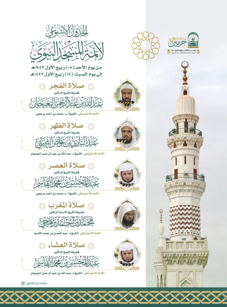 أوضحت رئاسة الشؤون الدينية بالمسجد الحرام والمسجد النبوي الجدول الأسبوعي لأئمة الحرمين الشريفين للفترة من يوم الأحد 8 ربيع الأول إلى السبت القادم 14 ربيع الأول 1447هـ، وذلك في إطار حرصها المستمر على تنظيم الشعائر، وتمكين المصلين من أداء صلواتهم في أجواء من الطمأنينة والسكينة.