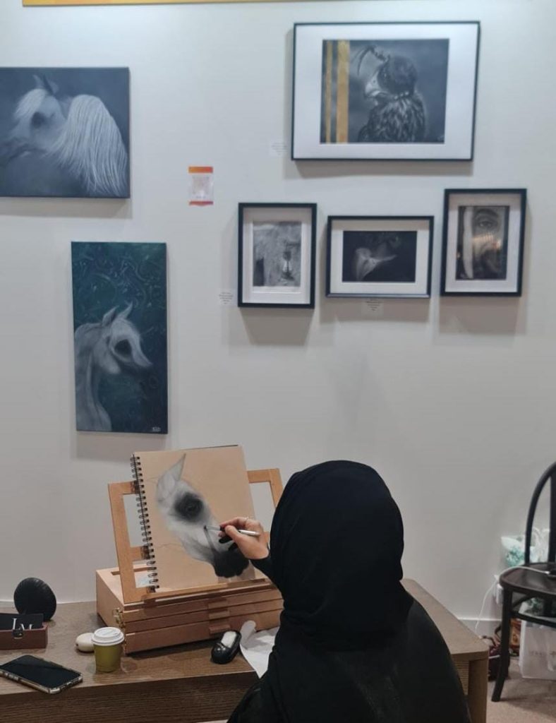 تشارك الفنانة لمياء الدرمكي في معرض أبوظبي الدولي للصيد والفروسية 2025 بجناحها الخاص للمرة الأولى، وتعد مشاركتها في المعرض جزءًا من مساهمتها المجتمعية لنشر الفنون والتعريف برسوماتها. كما يمنحها المعرض فرصة للتواصل مع كبار الفنانين والتعاون معهم من أجل المشاركة في المعارض الفنية المحلية والدولية.