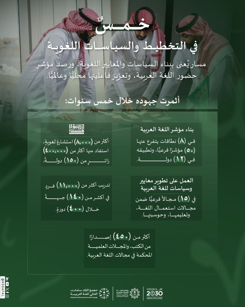 اللغة أصلٌ وشكلٌ راسخٌ من أشكال الحضور الإنساني على امتداده، ومرآة لقيمه وتراثه، وفي القرن الواحد والعشرين أصبحت هذه المهمة أشد تعقيدًا وأصعب، ومع ذلك فإن مجمع الملك سلمان العالمي للغة العربية رأى فرصًا كبيرة لنشر اللغة العربية عالميًا وتعزيز حضورها محليًا -في خمس سنوات منذ تأسيسه- عبر مساراته العلمية الأربعة: (التخطيط والسياسة اللغوية، والحوسبة اللغوية، والبرامج التعليمية، والبرامج الثقافية), فأخرج للغة العربية في باكورة أعماله في التخطيط والسياسة اللغوية “مؤشر اللغة العربية”، وهو مؤشر لغوي يقيس واقع استعمال اللغة العربية في النطاقات الحيوية المتنوعة.