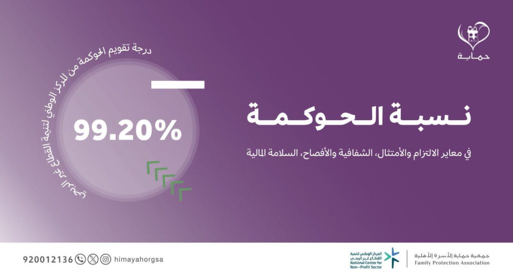 في إنجاز يُضاف إلى سجل نجاحاتها في مجال العمل الاجتماعي والإنساني، حصلت جمعية حماية الأسرة الأهلية على درجة 99.20 في تقييم حوكمة الجمعيات الأهلية لعام 2024، الصادر عن المركز الوطني لتنمية القطاع غير الربحي.