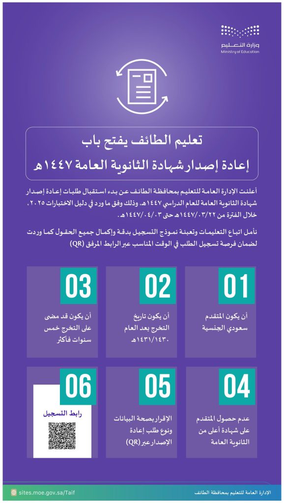 أوضحت الإدارة العامة للتعليم بمحافظة الطائف عن بدء استقبال طلبات إعادة إصدار شهادة إتمام المرحلة الثانوية العامة للعام الدراسي 1447هـ، وفق الضوابط المنظمة التي تتيح للطلاب والطالبات فرصة استخراج شهادة جديدة بعد مرور خمس سنوات على التخرج كحد أدنى، على أن يكون تاريخ التخرج بعد عام 1430/1431هـ.