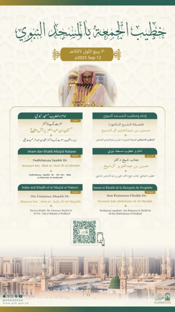 فيما يخطب ويؤم المصلين في المسجد النبوي فضيلة الشيخ الدكتور حسين بن عبدالعزيز آل الشيخ