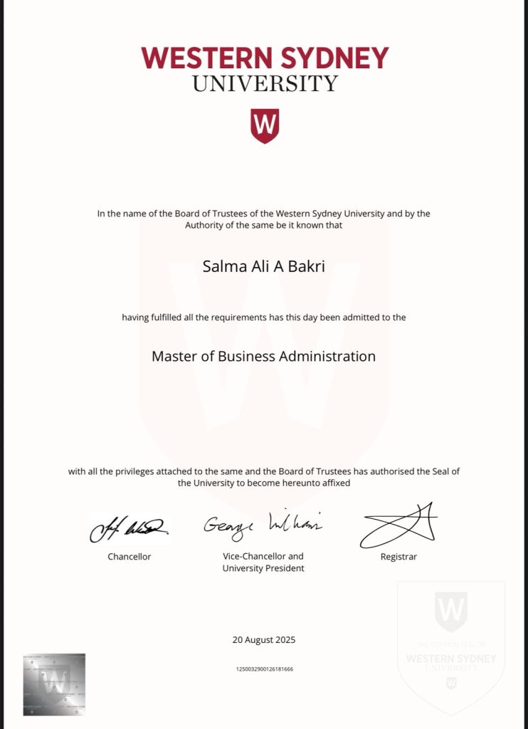 حصلت سلمى بنت علي بكري المبتعثة من برنامج خادم الحرمين الشريفين للابتعاث على الماجستير في إدارة الأعمال من جامعة غرب سيدني في أستراليا.