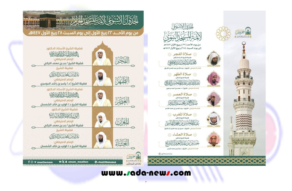 اصدرت الشؤون الدينية بالمسجد الحرام والمسجد النبوي الجدول الأسبوعي لأئمة المسجد الحرام والمسجد النبوي من يوم غد الأحد ٢٢ ربيع الأول إلى يوم السبت القادم ٢٨ ربيع الأول ١٤٤٧هـ