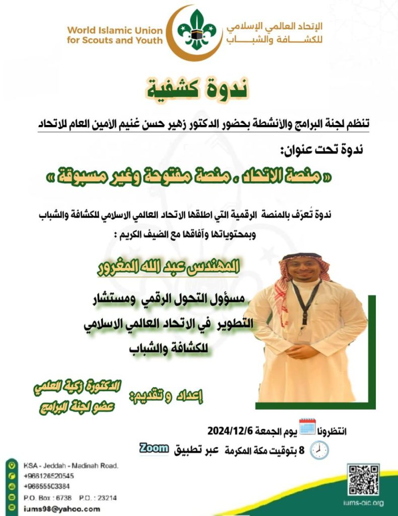 تنظم لجنة البرامج والأنشطة بالاتحاد العالمي الإسلامي للكشافة والشباب ندوة كشفية بعنوان : منصة الاتحاد منصةمفتوحة وغير مسبوقة .