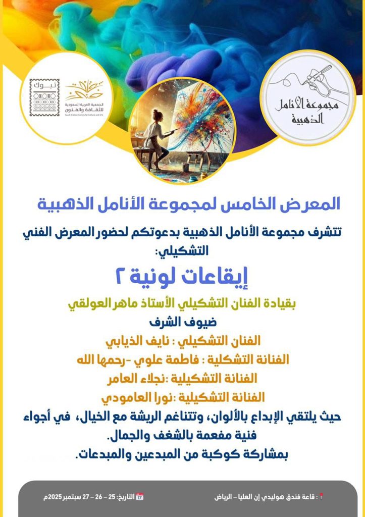 تنطلق يوم الخميس 25 سبتمبر فعاليات المعرض الفني الخامس لمجموعة الأنامل الذهبية تحت عنوان “إيقاعات لونية 2” وذلك في فندق هوليدي إن العليا بالرياض بمشاركة 80 فنانًا وفنانة من داخل المملكة وخارجها.