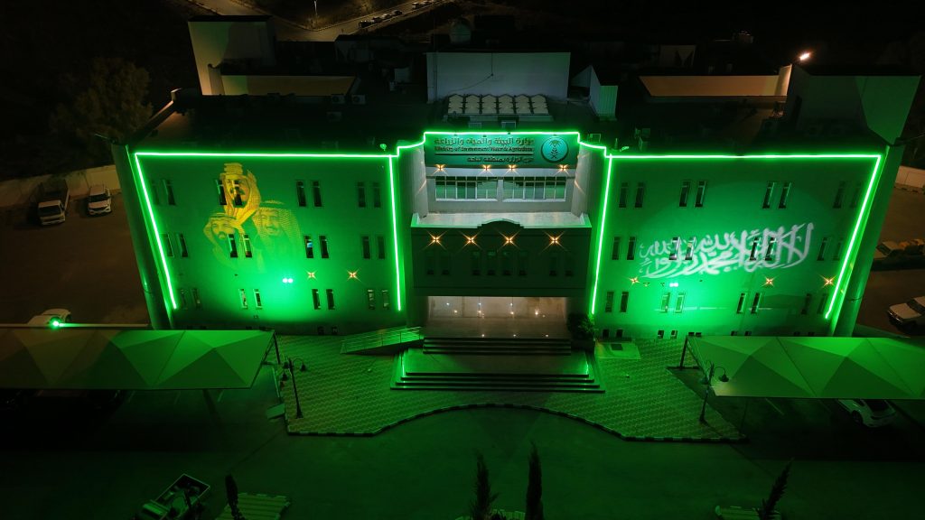 توشّح مبنى فرع وزارة البيئة والمياه والزراعة بمنطقة الباحة باللون الأخضر احتفاءً باليوم الوطني الـ95 للمملكة العربية السعودية، تعبيراً عن مشاعر الفخر والاعتزاز بما تحقق للوطن من إنجازات في مختلف المجالات.