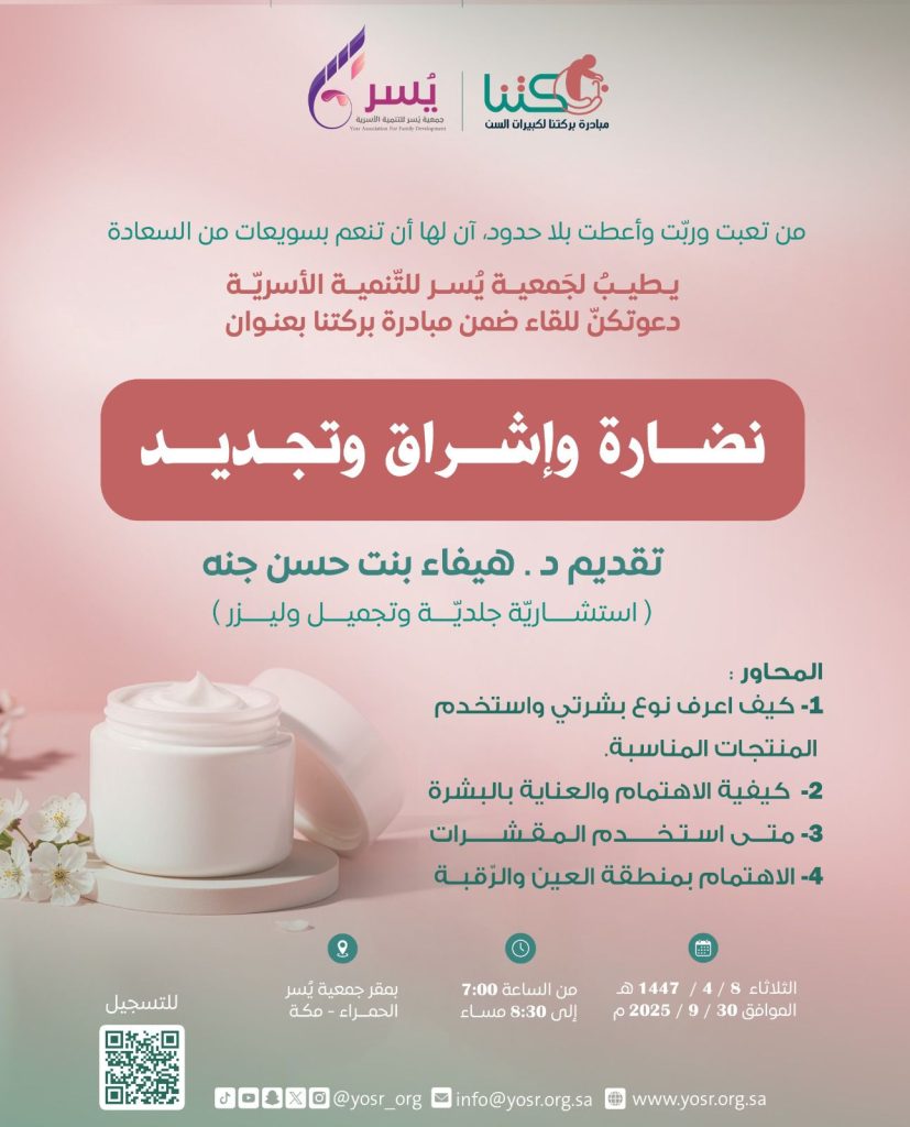 ويقام اللقاء بقاعة بركتنا بجمعية يُسر للتّنمية الأسريّة بمكة المكرمة – حي الحمراء.
