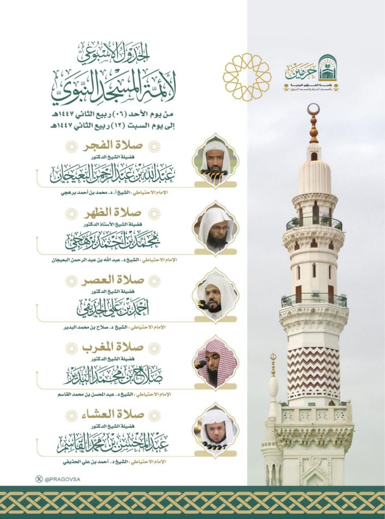 حددت رئاسة الشؤون الدينية بالحرمين الشريفين الجدول الأسبوعي لأئمة المسجد الحرام والمسجد النبوي من اليوم الأحد ٦ ربيع الآخر إلى يوم السبت القادم ١٢ ربيع الآخر ١٤٤٧هـ.