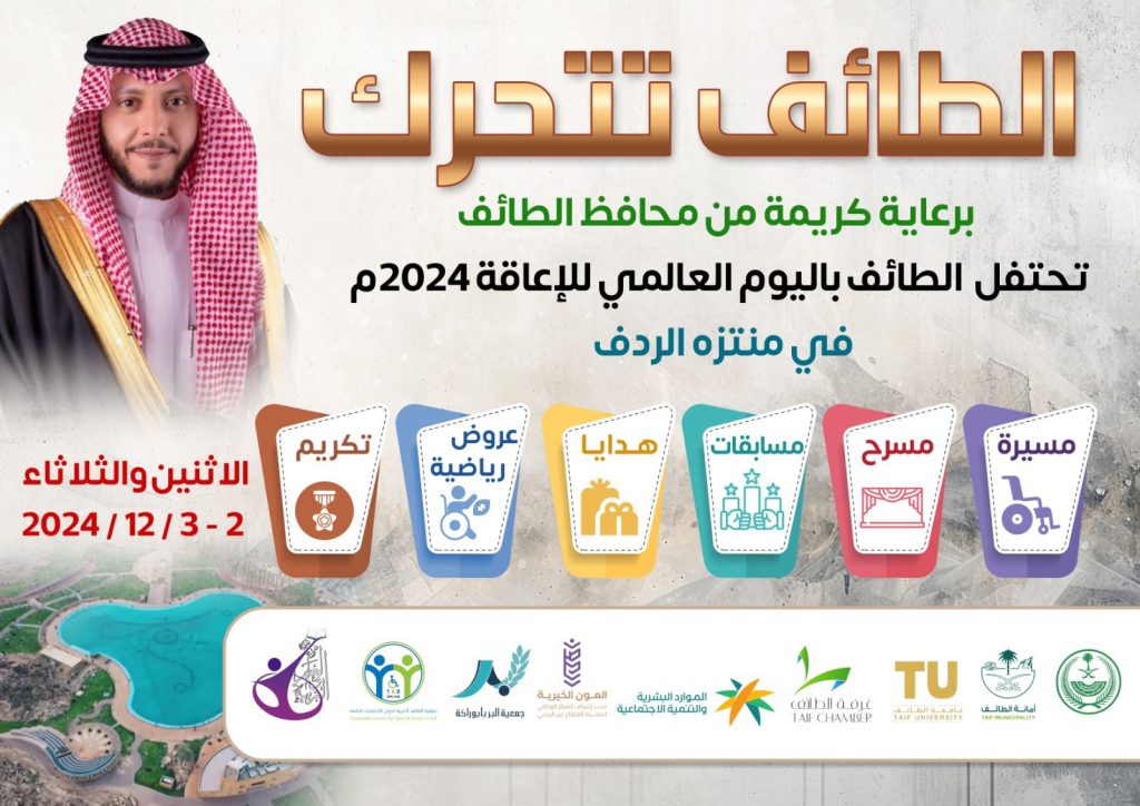 برعاية محافظ الطائف تطلق جمعية الطائف الخيرية لذوي الاحتياجات الخاصة يوم غدٍ الاثنين فعالية اليوم العالمي للإعاقة تحت شعار ” التمكين من اجل مستقبل شامل ومستدام ” بمنتزه الردف من خلال مبادرة الطائف تتحرك .