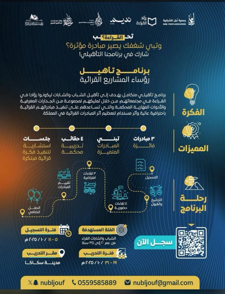 أطلقت جمعية نبُل الشبابية بمنطقة الجوف برنامجًا نوعيًا بعنوان «تأهيل رؤساء المشاريع القرائية»، الهادف إلى إعداد وتأهيل الشباب والشابات المهتمين بالقراءة ليصبحوا قادة مبادرات قرائية مؤثرة في المجتمع.