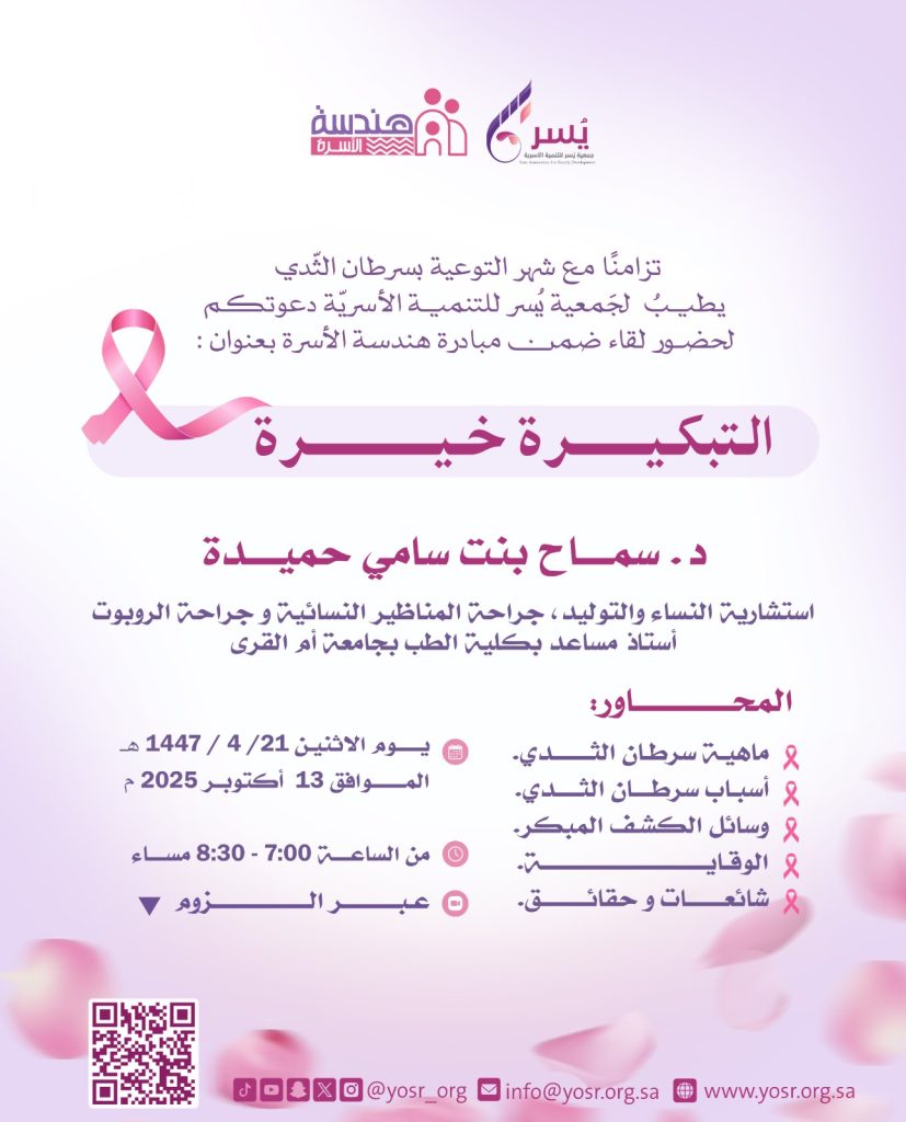 تنظم َجمعية يُسر للتنمية الأسريّة بمكة المكرمة لقاء ضمن مبادرة هندسة الأسرة بعنوان :