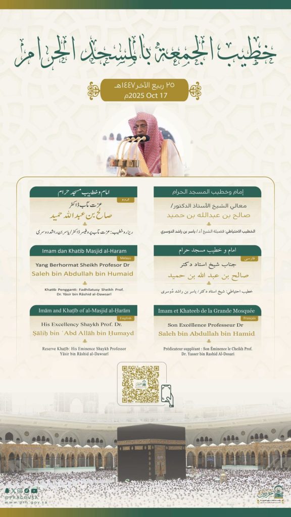 أوضحت رئاسة الشؤون الدينية بالمسجد الحرام والمسجد النبوي، عن أسماء خطيبا وإماما صلاة الجمعة في الحرمين الشريفين 25 ربيع الآخر 1447هـ وذلك ضمن جدولها الدوري لتنظيم الإمامة والخطابة.