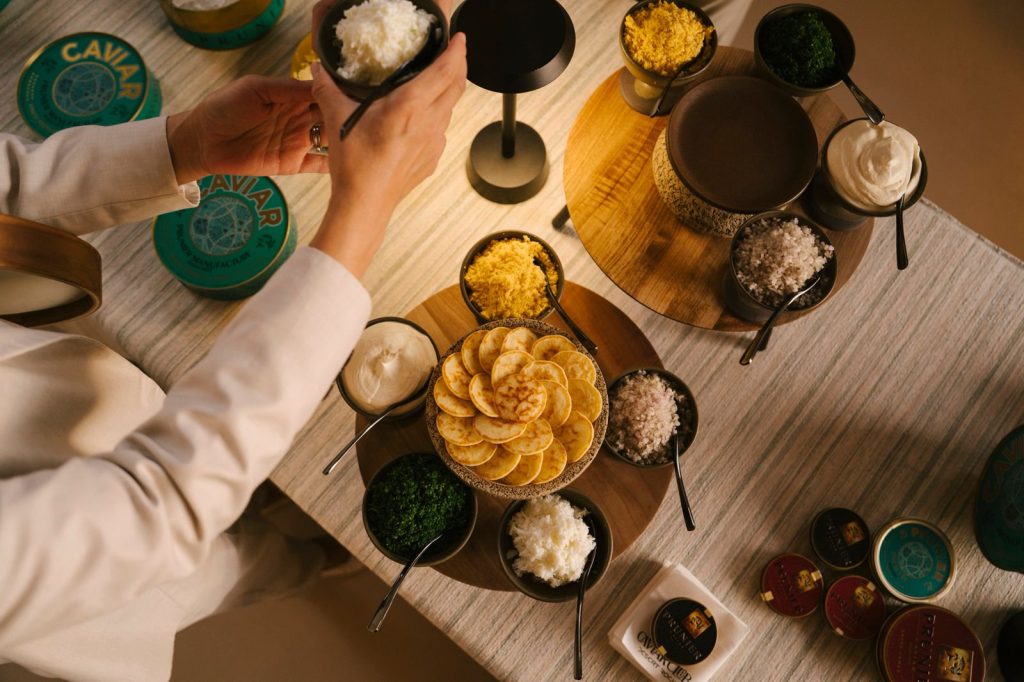 وأستخدم الشيف مكونات فاخرة أبرزها كافيار برونييه (Prunier Caviar) وأدوات مائدة من كريستوفل (Christofle)، ليجسّد مزيجاً من الأناقة الباريسية في قلب الصحراء السعودية.