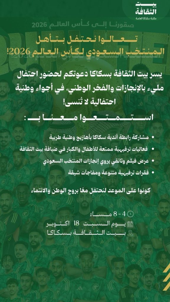 أعلن بيت الثقافة بسكاكا عن تنظيم احتفالية وطنية كبرى بمناسبة تأهل المنتخب السعودي لكرة القدم إلى نهائيات كأس العالم 2026، وذلك مساء يوم السبت 18 أكتوبر، من الساعة الرابعة حتى الثامنة مساءً، في مقر بيت الثقافة بسكاكا.