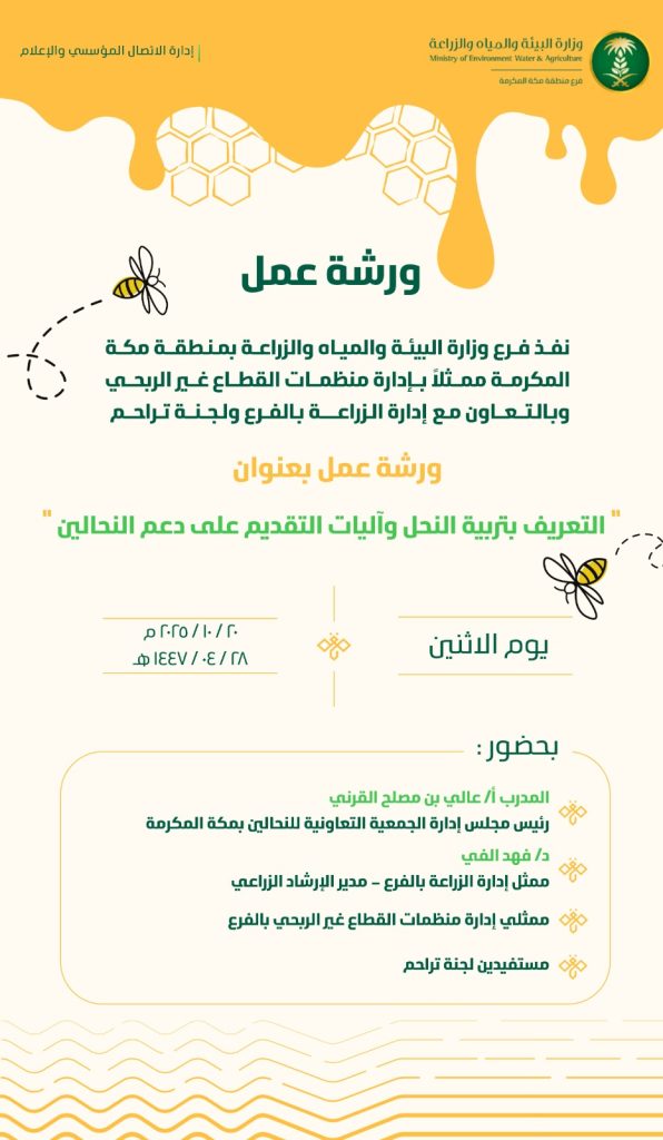 نفّذ فرع وزارة البيئة والمياه والزراعة بمنطقة مكة المكرمة، ممثلًا بـ إدارة منظمات القطاع غير الربحي، وبالتعاون مع إدارة الزراعة بالفرع ولجنة تراحم، ورشة عمل تدريبية بعنوان “التعريف بتربية النحل وآليات التقديم على دعم النحالين”