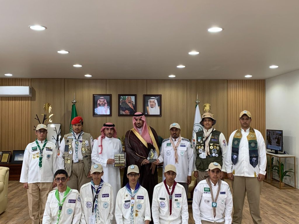 مدير ثانوية الأمير حسام بن سعود بالمندق الأستاذ محمد علي والقائد الكشفي الأستاذ علي جمعان والفريق الكشفي بثانوية الأمير حسام بمناسبة حصول الفريق الكشفي على الوسام الذهبي والمركز الأول في منافسات رسل السلام لتميز الكشفي على مستوى المملكة بمحافظة الطائف.