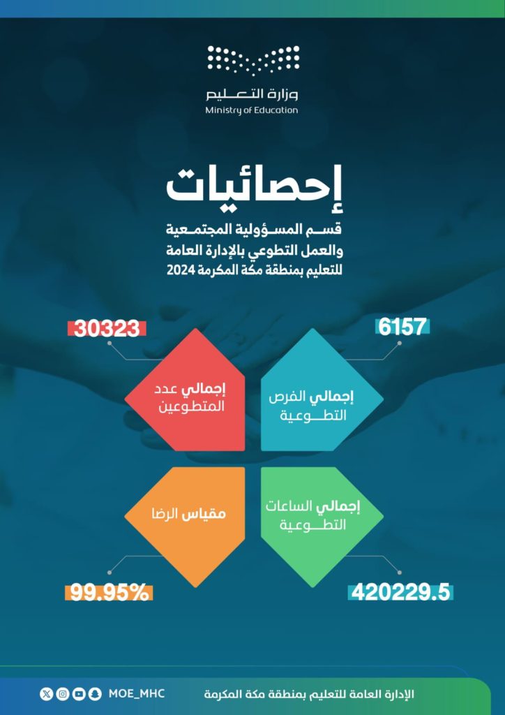 ﺗﺤﺘﻔل ﺍﻹﺩﺍﺭﺓ ﺍﻟﻌﺎﻣﺔ ﻟﻠﺘﻌﻠﻴﻢ ﺑﻤﻨﻄﻘﺔ ﻣﻜﺔ ﺍﻟﻤﻜﺮﻣﺔ ﺑﺎﻟﻴﻮﻡ ﺍﻟﺴﻌﻮﺩﻱ ﻭﺍﻟﻌﺎﻟﻤﻲ ﻟﻠﺘﻄﻮﻉ ﺗﺤﺖ ﺷﻌﺎﺭ ) ﻣُﺠﺘﻤﻊ ﻣﻌﻄﺎﺀ وذلك خلال الفترة من 4 – 9 جمادى الآخرة 1446 هـ.