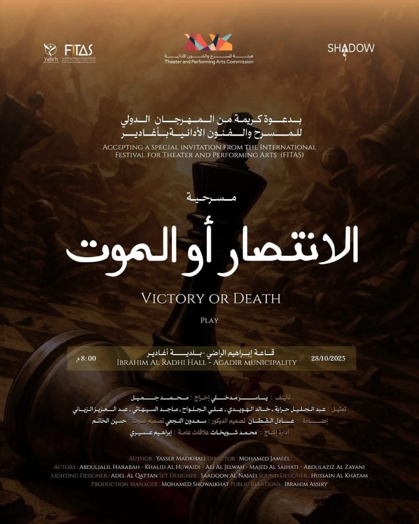 بدعم من هيئة المسرح والفنون الأدائية وبدعوة كريمة من المهرجان الدولي للمسرح وفنون الخشبة بمدينة أغادير في المملكة المغربية في الفترة من 24 -28 اكتوبر 2025 وتشارك فرقة شدو بمسرحية [الانتصار أو الموت] بين العروض المسرحية الدولية المقدمة من المغرب والامارات وبلجيكا وفرنسا وإسبانيا وسويسرا والسنغال وألمانيا وألبانيا.