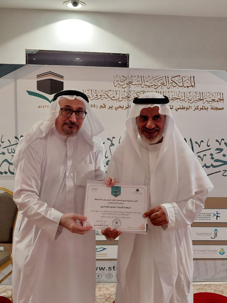 كرمت الجمعية الخيرية لتحفيظ القرآن الكريم بجنوب مكة وقراها مدير مكتب صحيفة صدى نيوز إس بالمنطقة الغربية الأستاذ منصور نظام الدين قريشي – وجهوده المبذولة وتعاونه المثمر والفعال في دعم الجمعية لخدمة القرآن الكريم وأهله في برامج وأنشطة الجمعية سائلين المولى ان يجعل ذلك في ميزان حسناته