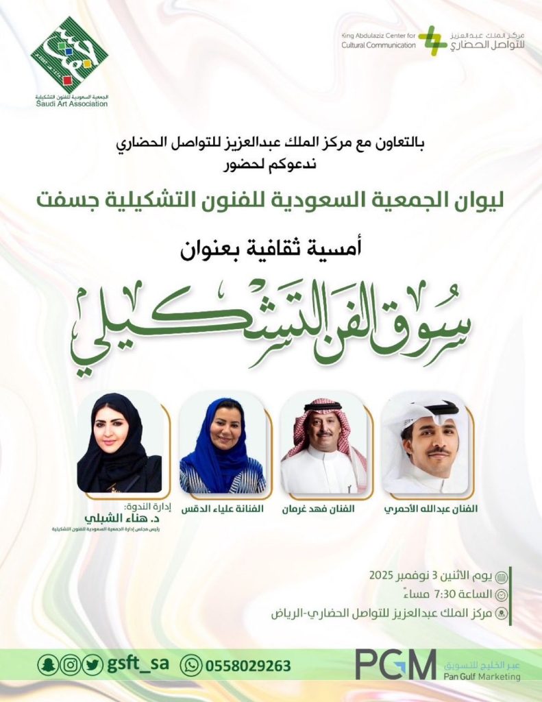 تنظم الجمعية السعودية للفنون التشكيلية (جسفت) بالتعاون مع مركز الملك عبدالعزيز للتواصل الحضاري، ندوة ثقافية بعنوان “سوق الفن التشكيلي”، وذلك يوم الاثنين الموافق 3 نوفمبر 2025، في تمام الساعة 7:30 مساءً، بمقر المركز في الرياض.